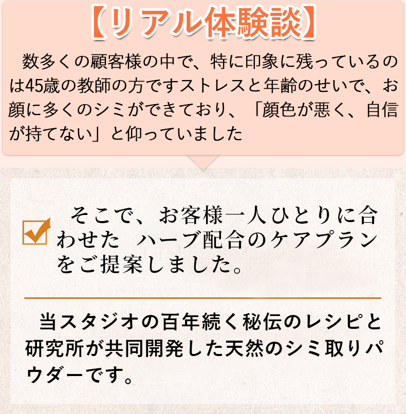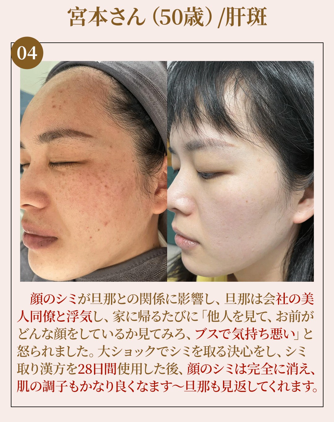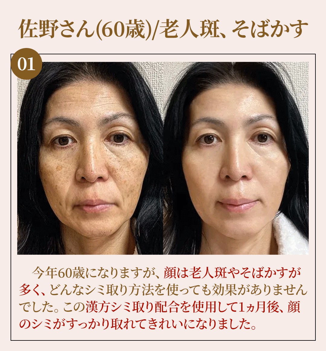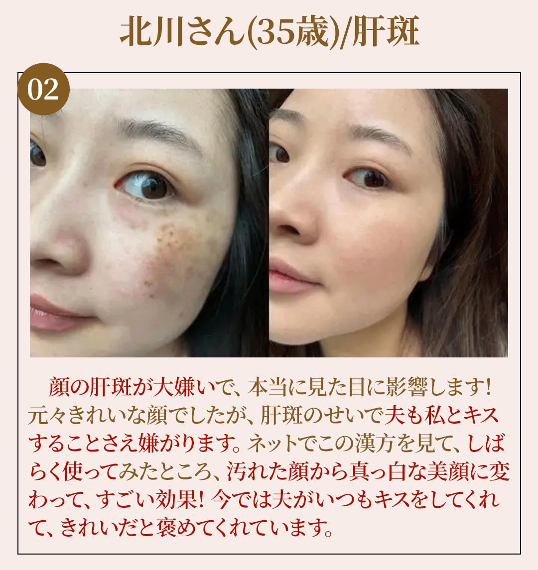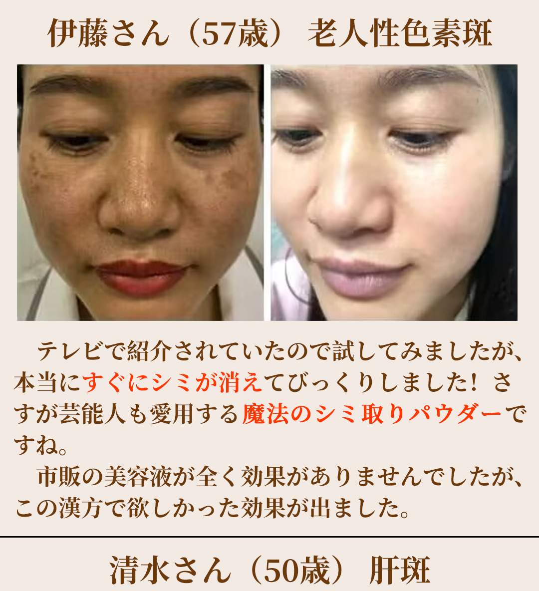 スキンケアの専門家の漢方シミ取り商品は本当に効果的で、使い始めてしばらく経ちますが、シミが薄くなり、肌も超潤い~!