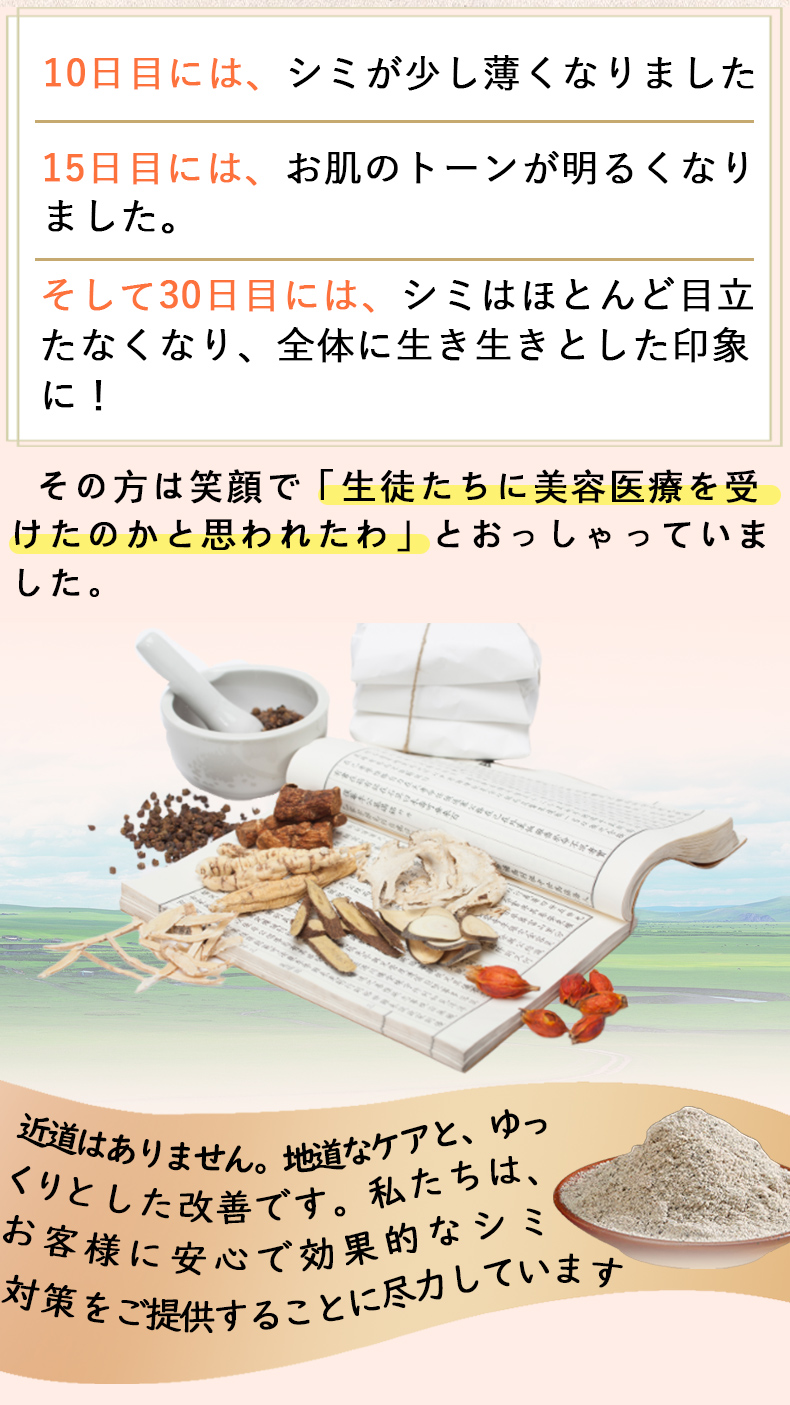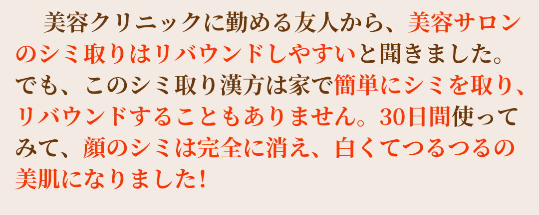 これまでにたくさんのシミ対策方法を試してきましたが、どれも効果ゼロでした。スキンケアの専門家の漢方シミ取り製品を試してみていると、効果が意外に良いです。顔がすごく綺麗でみずみずしいです~。