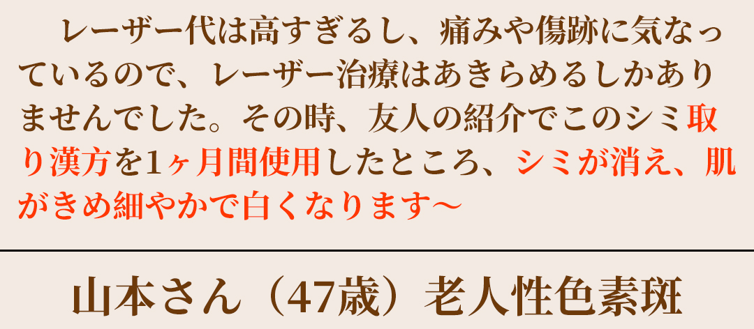 顔に老人性色素斑をてきたので、色んな方法を試しても改善されずそのままでした。先生の製品を購入し、30日間使用してみると、すっかり消え、肌が白く滑らかになってきます。