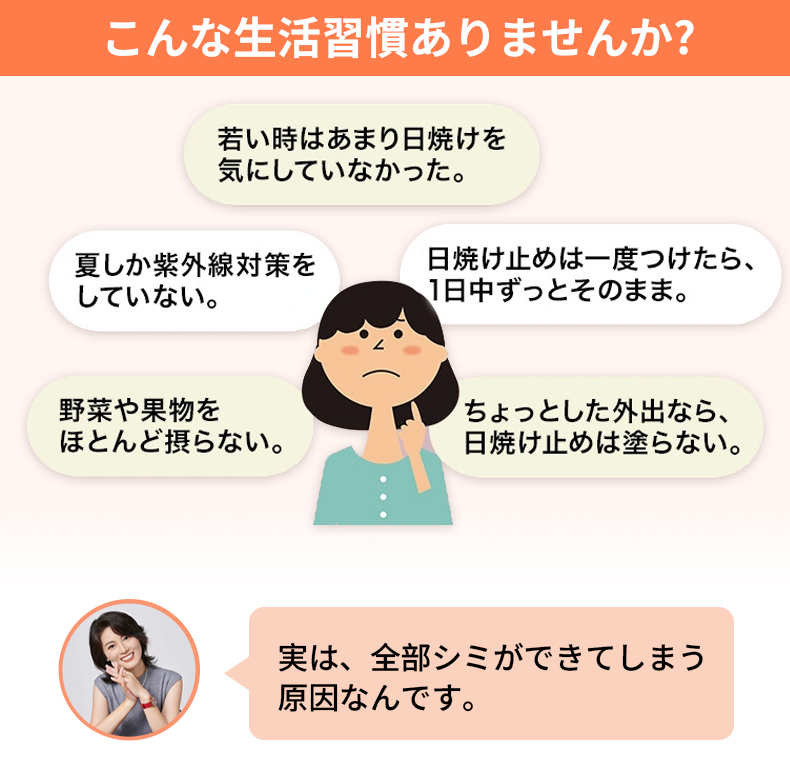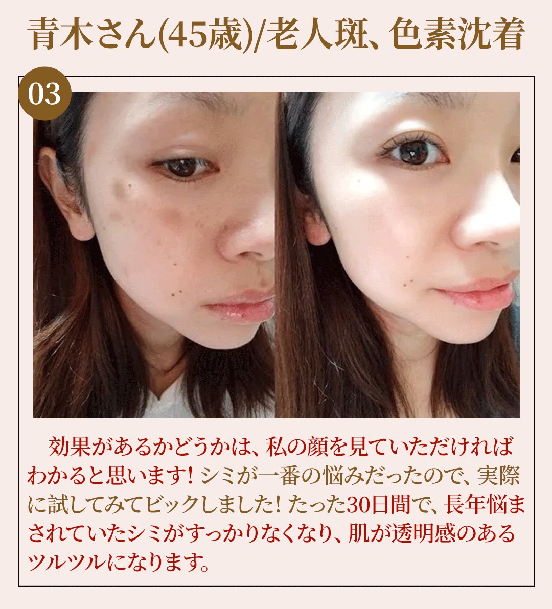 長い間顔に日焼けによるシミがあり、どうしても改善したいと思っていたのでこのシミ対策商品を試してみました。自分で使ってみて初めて良し悪しが分かるし、日焼けによるシミが消えた今、その効果は期待以上でした~